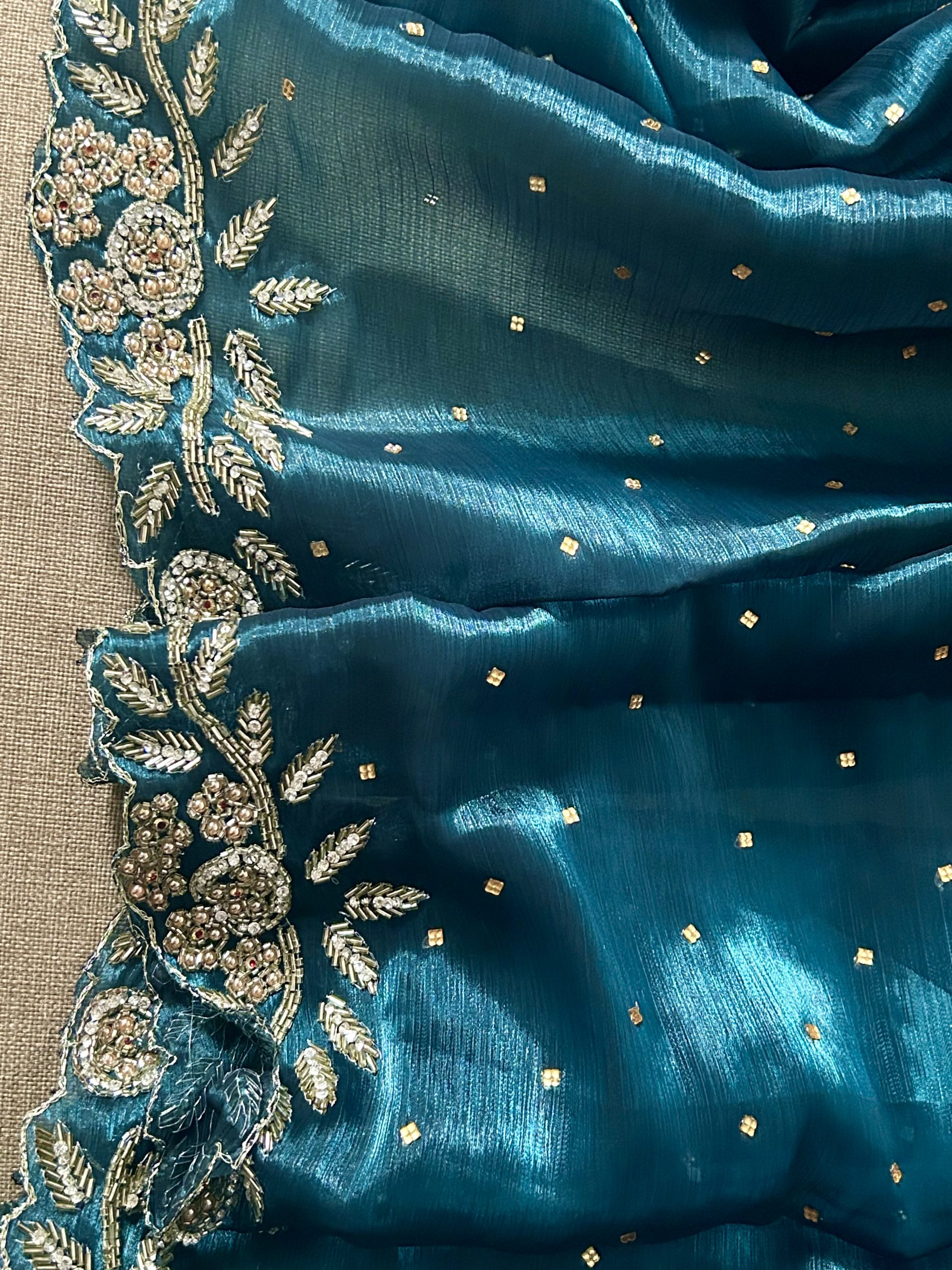 Saree Embellishment: Floral embroidery with zircon stonework and scalloped edge