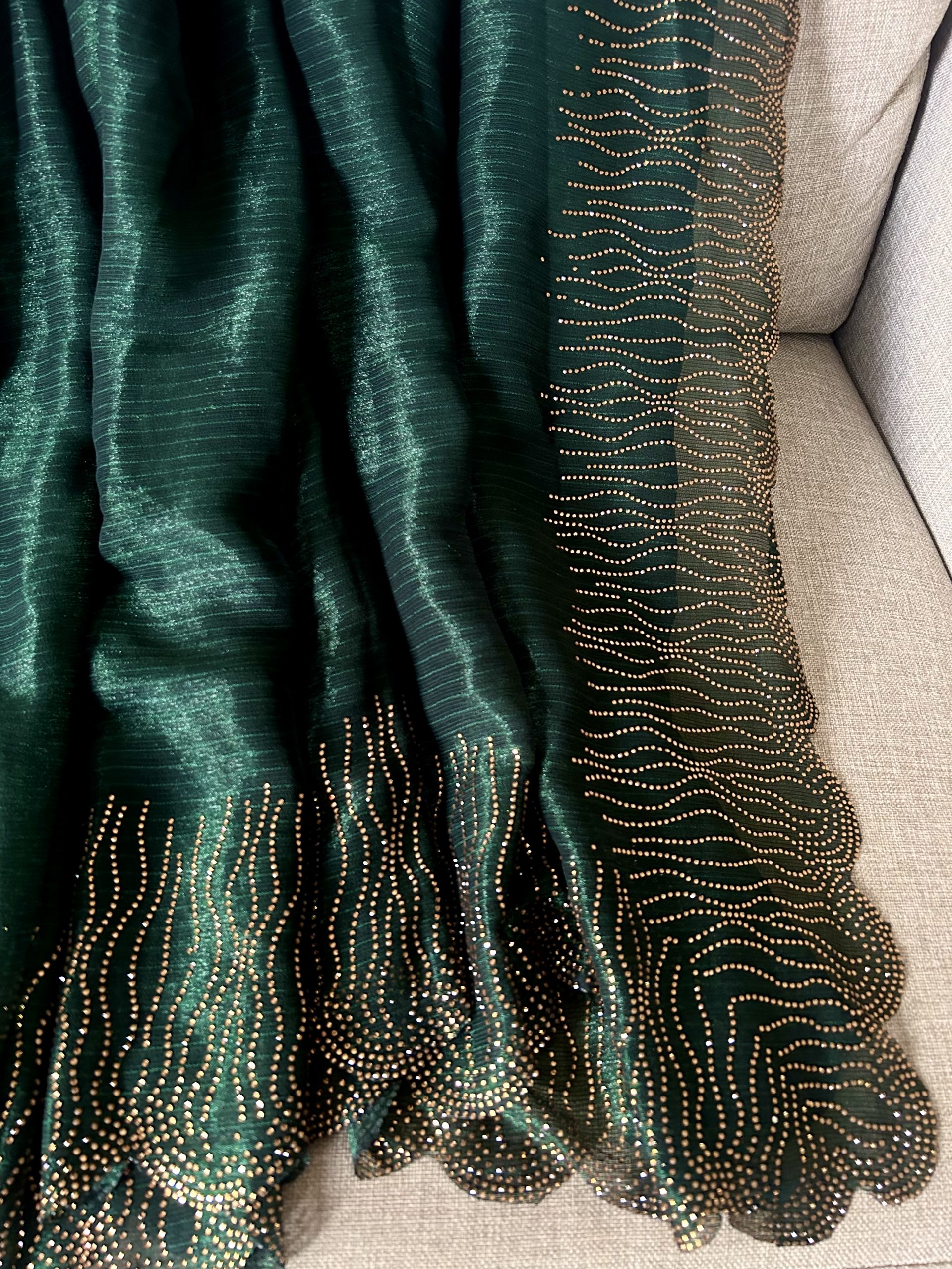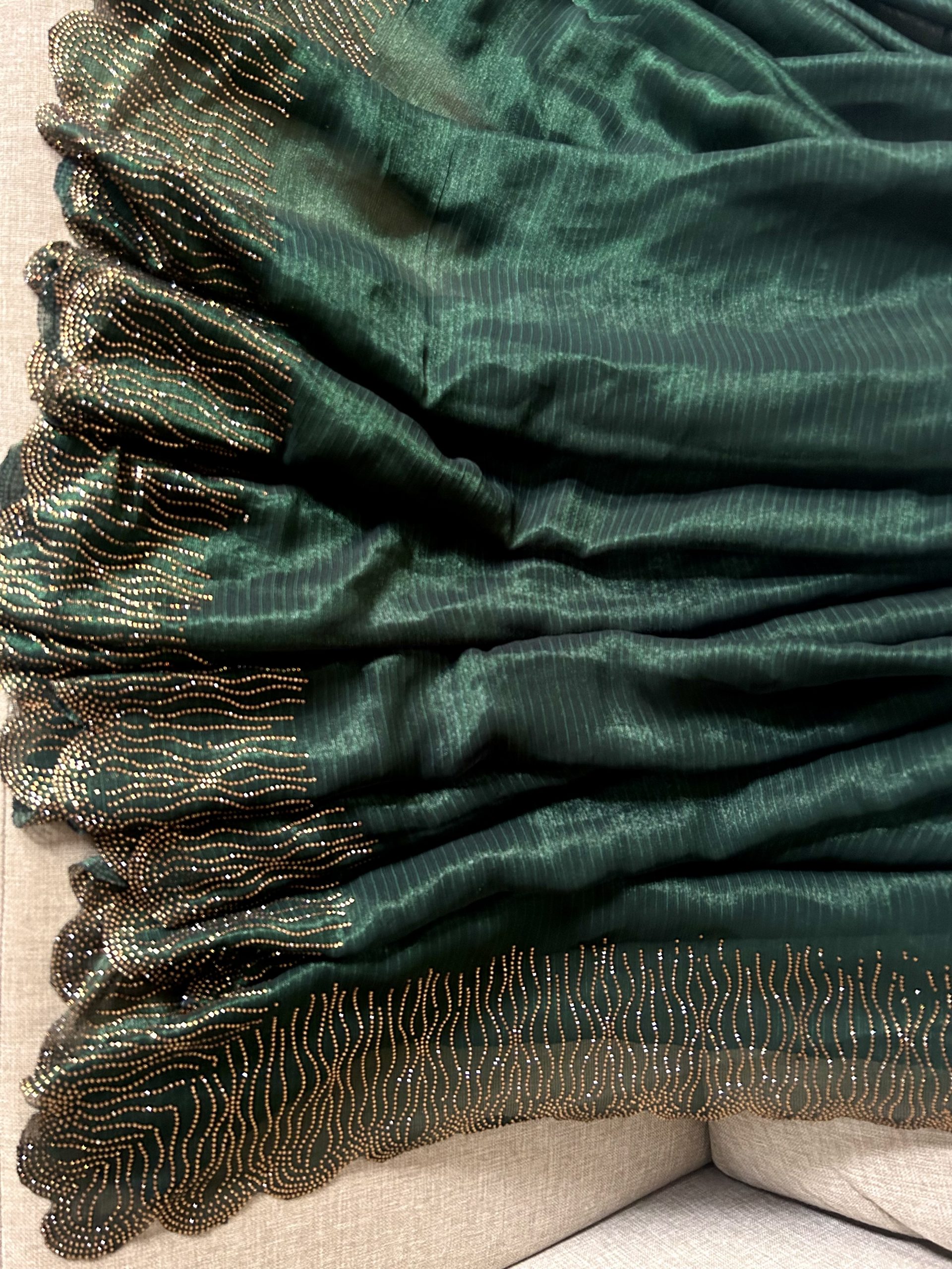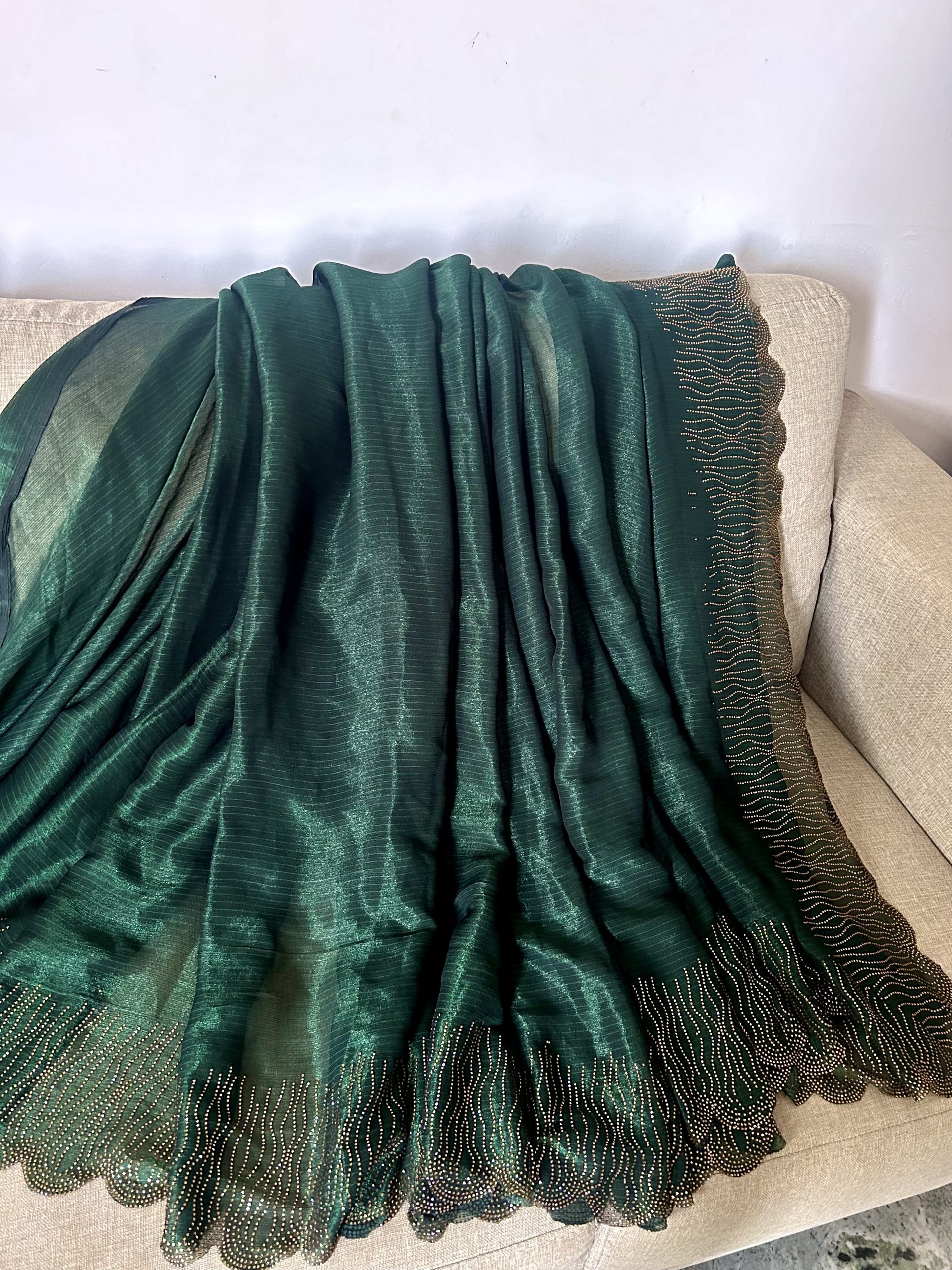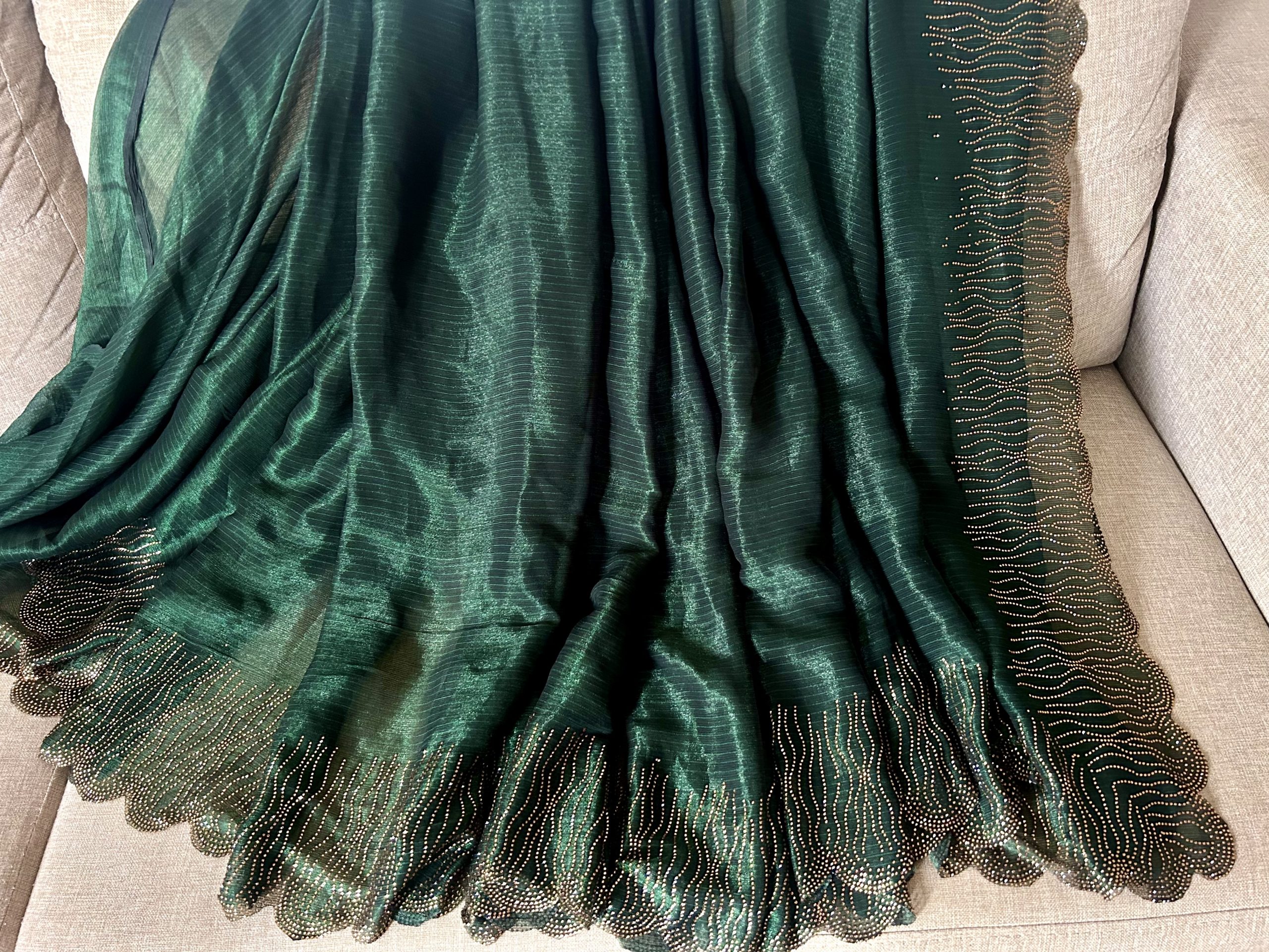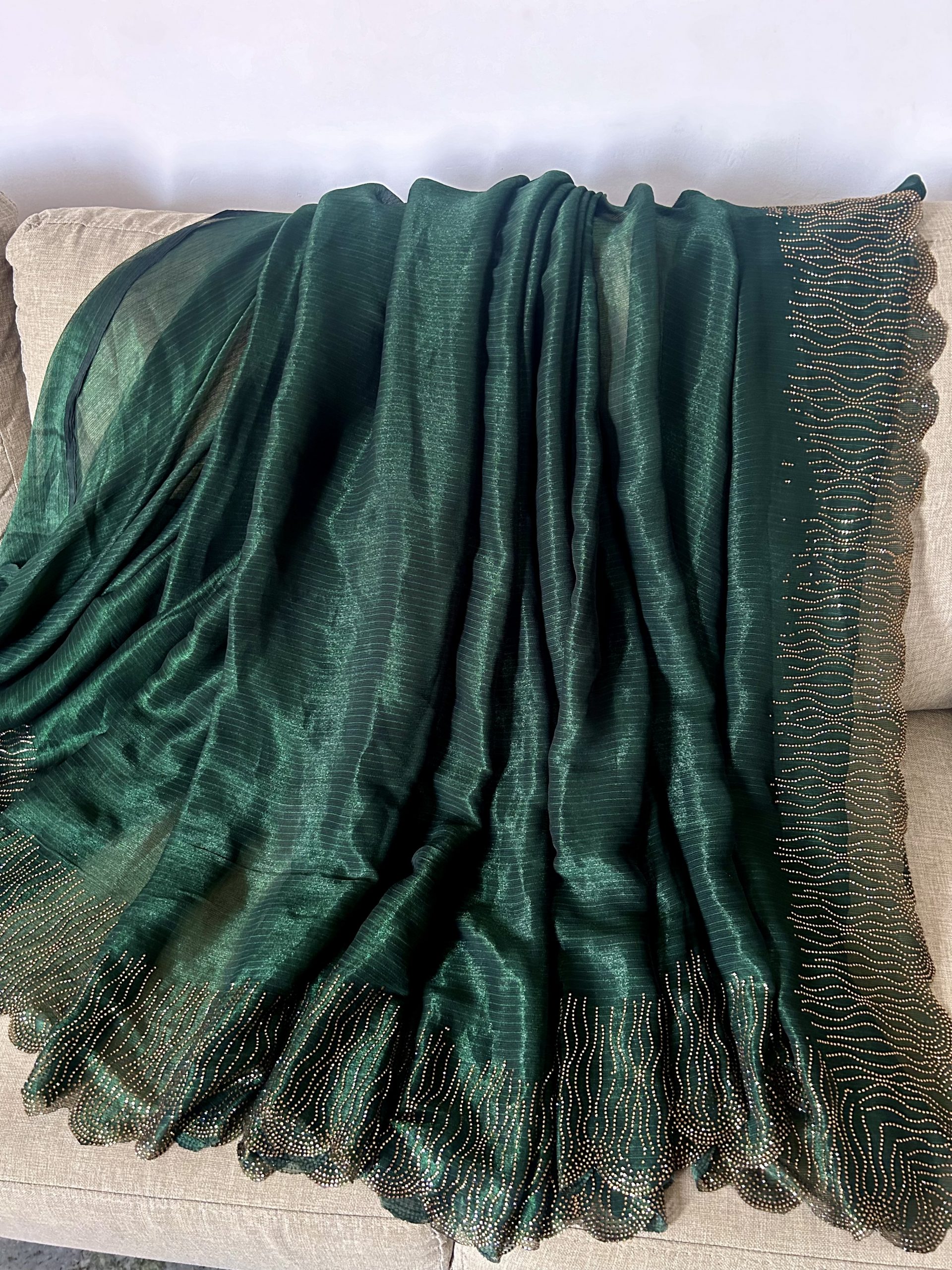 Saree Colour: Pine Green / Bottle Green with golden shimmer stone work scalloped border